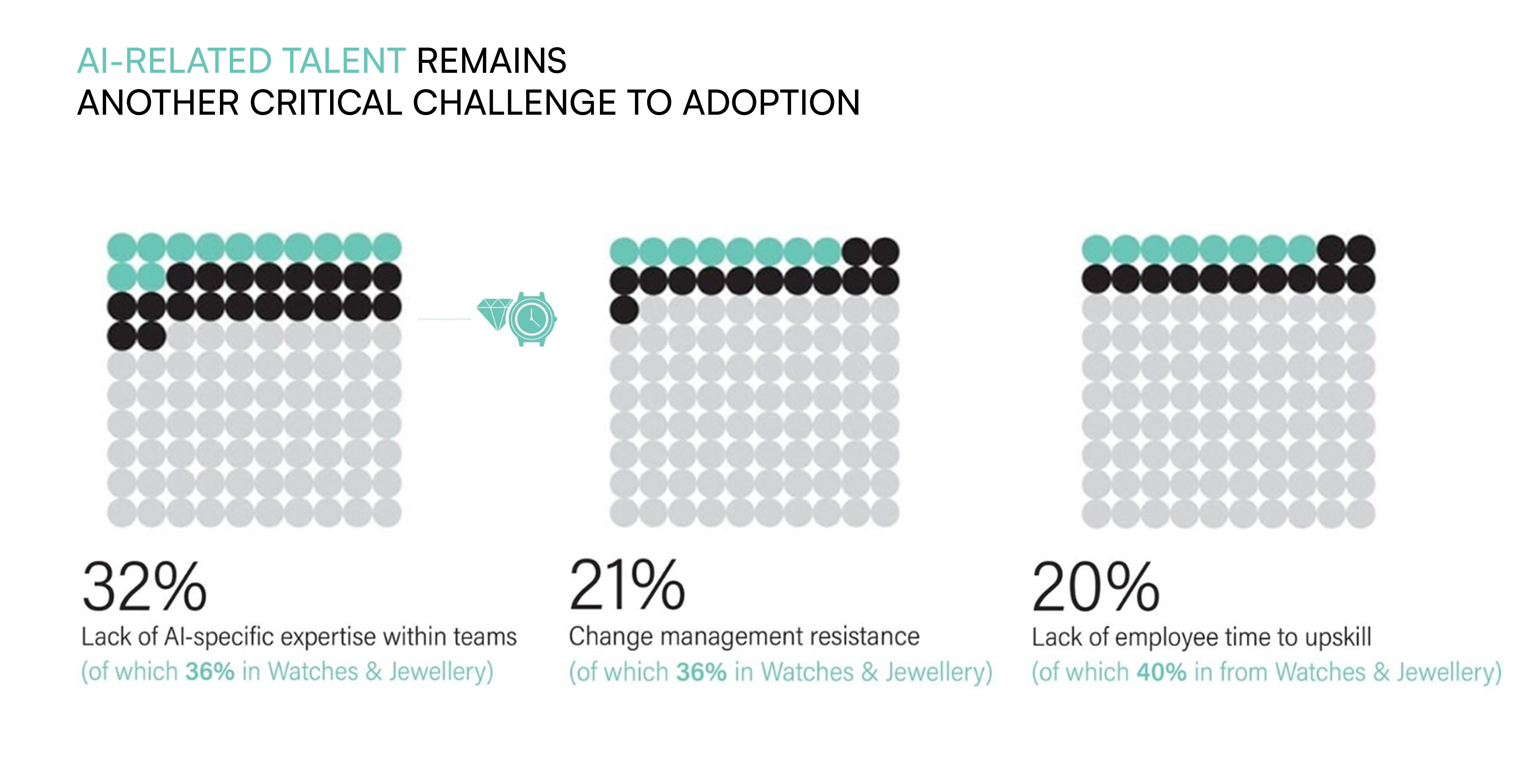 Beyond data, talent represents the next most significant barrier to AI adoption, but the challenge facing luxury is distinctly unique. 32% of executives identify this skills gap as a primary obstacle. However, the core issue likely isn’t a simple lack of technical expertise but a shortage of hybrid talent – individuals who can bridge information technology with the nuanced, qualitative world of brand equity. At the same time, around 21% cite change management resistance as a barrier, indicating deep-seated cultural friction between data-driven futures and organisational cultures built on heritage and human craftsmanship.