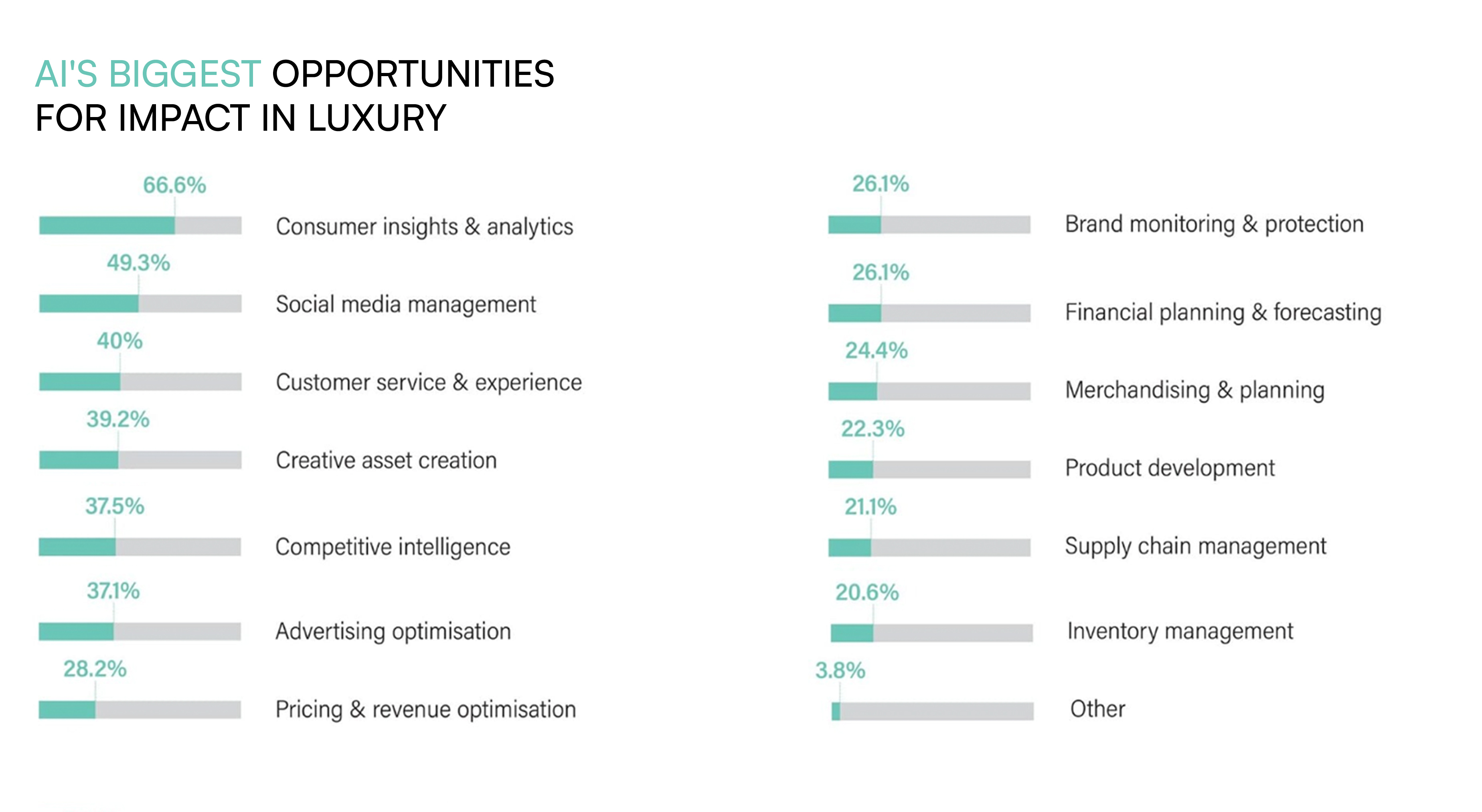 On top of that, executives also recognise AI’s potential across social media management (49%) and creative asset creation (39%), indicating that luxury’s AI ambitions extend beyond understanding customers to engaging them more effectively and producing content at the velocity modern platforms demand. Yet none of these applications approach the priority accorded to consumer insights, underscoring that knowing your client remains the foundation upon which all other marketing and creative efforts must build.