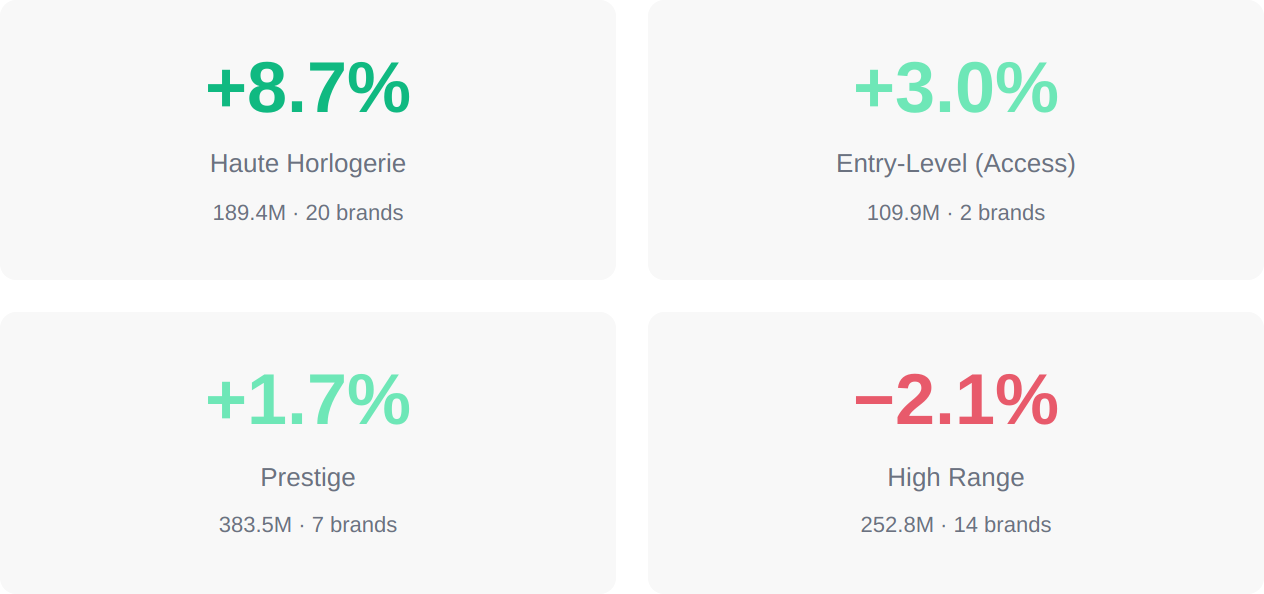 Haute Horlogerie led the field at +8.7%, more than four times the blended market rate. Entry-Level (Access) posted +3.0%. Prestige grew a modest +1.7%. And High Range, the only segment in the red, contracted −2.1%. The pattern is clear: the further up the price ladder, the stronger the growth. The segment that asks consumers to pay the most, and delivers the most horological substance, rewarded its brands most handsomely. High Range, where brands compete on heritage and design against the gravitational pull of the Prestige tier above, was the only segment to lose ground.