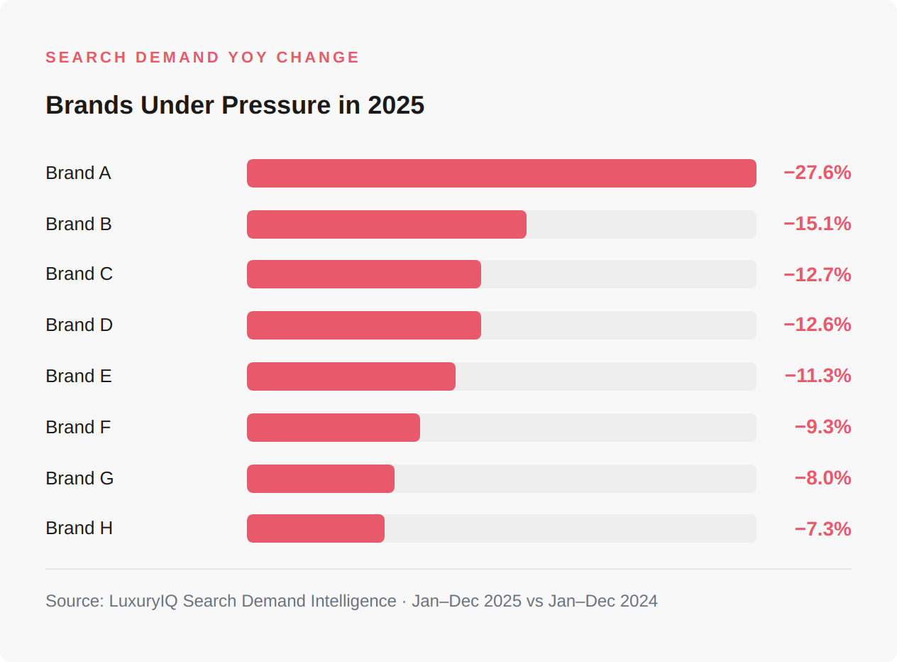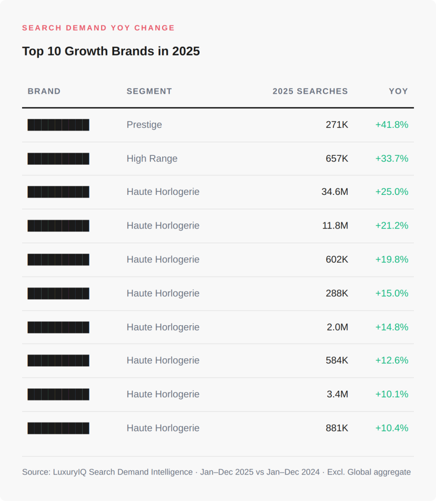 Some haute horlogerie names saw search demand grow +25% in 2025. Others surged +21% or climbed +15%. Meanwhile, several mid-range brands fell −8% or worse. The luxury watch market didn’t decline in 2025, it rotated. Demand moved decisively upmarket, rewarding brands with horological credibility and collector cachet while punishing those caught in the accessible middle.