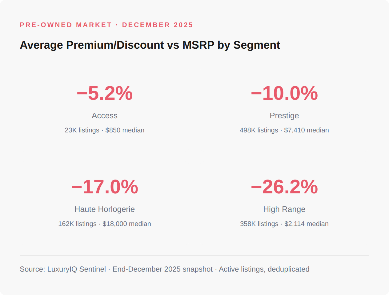 High Range’s −26% discount tells a starker story. With 358K active listings and a median price of just $2,114, the secondary market is flooded with inventory. New buyer demand isn’t absorbing it. For brands in this segment, every pre-owned listing at −26% to MSRP is a competitor sitting on the same retailer’s screen and often the same customer’s wrist.