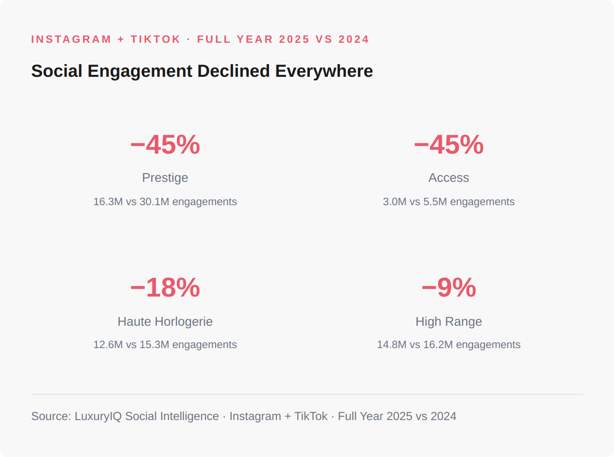 These are dramatic numbers: Prestige and Access both fell −45% year-on-year. The scale of the decline, particularly at the top, demands careful interpretation. Some of this is structural: algorithm changes on Instagram and TikTok have compressed organic reach across all categories, not just watches. Posting frequency and content mix also vary by brand and year, which can amplify or dampen engagement independently of audience behavior.