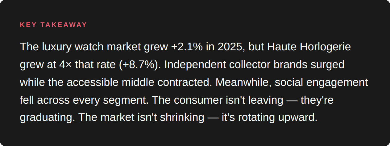 Independent haute horlogerie surged while the accessible middle contracted, and social media went quiet everywhere.