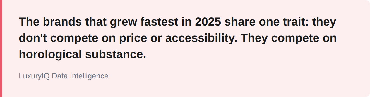 Independent haute horlogerie surged while the accessible middle contracted, and social media went quiet everywhere.