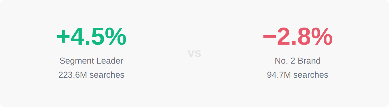 Prestige, the segment anchored by the market’s largest brand, grew +1.7% overall, but the detail matters. The segment leader grew +4.5% to 223.6M searches, reinforcing its position as the gravitational center of the watch market. But the second-largest Prestige brand slipped −2.8% and another key player dropped −8.3%, suggesting the segment’s growth is driven by its anchor rather than broad-based momentum.