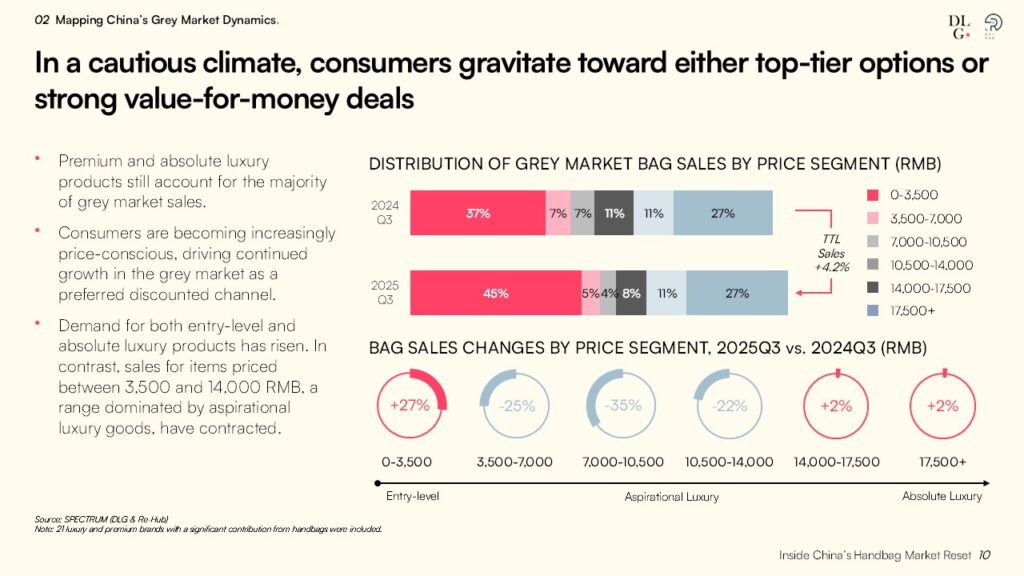 Compared with the third quarter of 2024, handbag sales rose by 4.2 percent in 2025 within the grey market. The data mirrors broader polarisation trends. Sales of handbags priced below RMB 3,500 surged by 27 percent, while products above RMB 14,000 grew by 2 percent. In contrast, the mid-range price segment declined sharply by 26 percent.